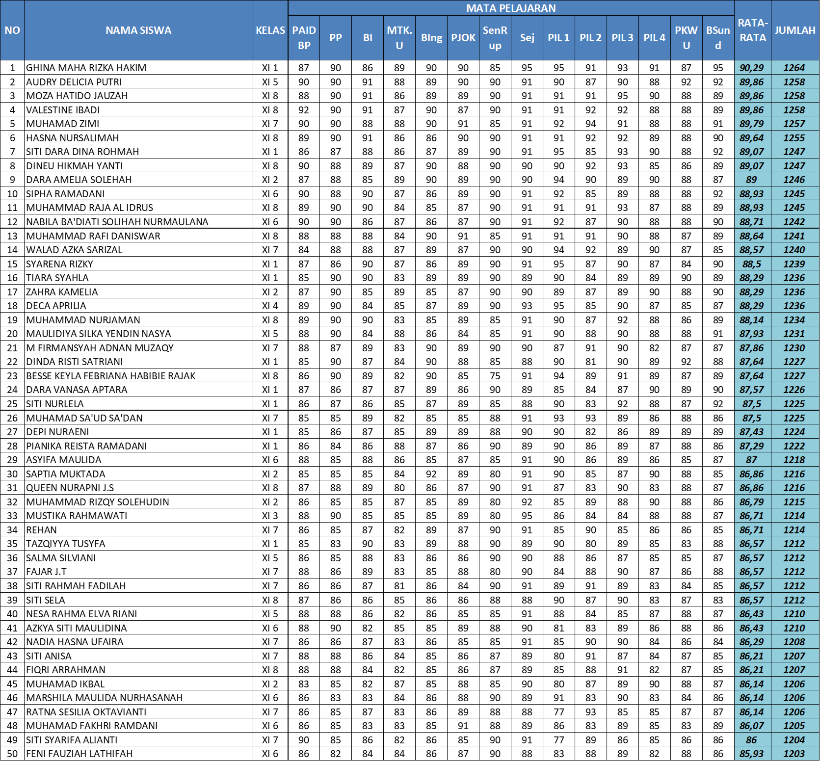 Hari ini sekolah mengumumkan Top 50 Nilai Rapor Semester 1 Kelas XI. Kami mengucapkan selamat kepada siswa-siswi yang namanya tercantum. Prestasi ini merupakan hasil dari usaha, kedisiplinan, dan doa yang terus dijaga.