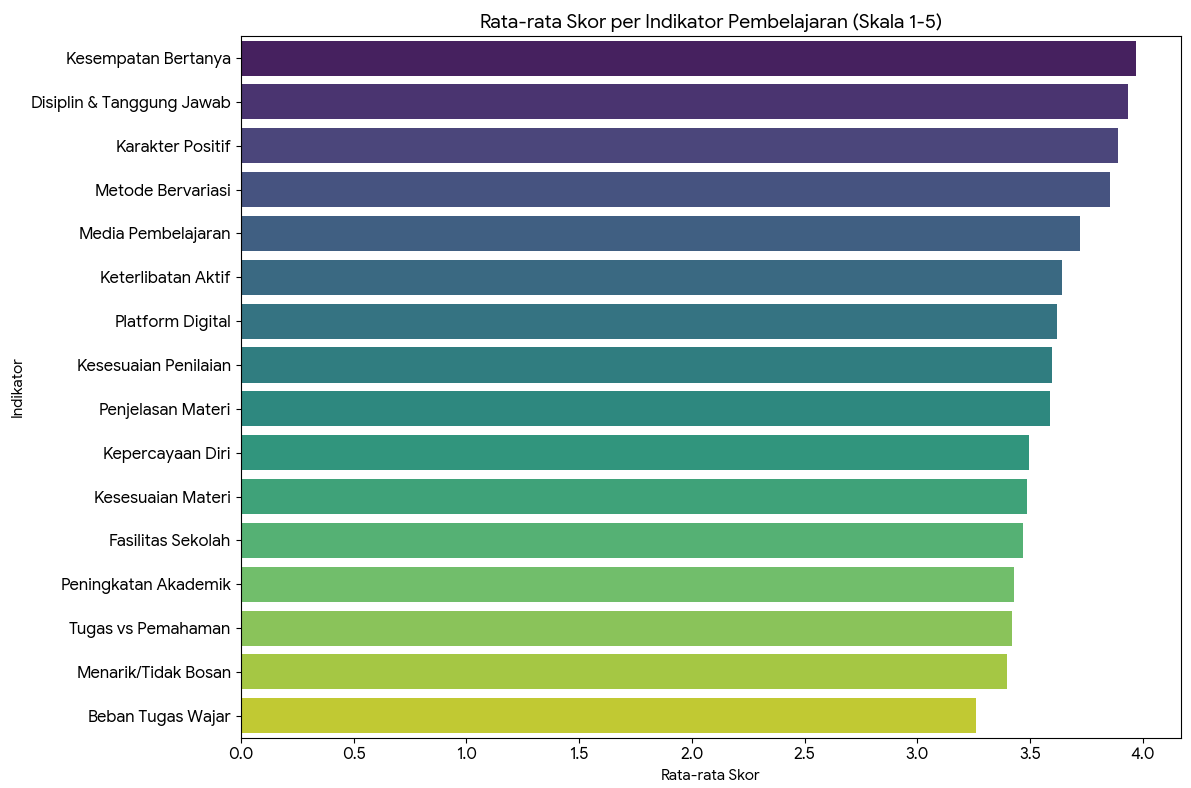 Secara umum, tidak ada siswa yang memberikan penilaian "Buruk" atau "Sangat Buruk" secara eksplisit dalam kategori utama, menunjukkan tingkat kepuasan yang berada pada level menengah ke atas.