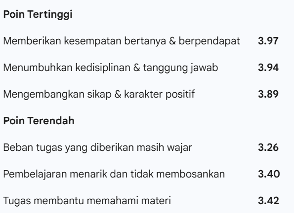 Analisis: Guru dinilai sangat baik dalam memberikan ruang komunikasi dan membentuk karakter siswa. Namun, aspek beban tugas dan daya tarik metode pembelajaran menjadi area yang perlu diperbaiki karena mendapatkan skor terendah.